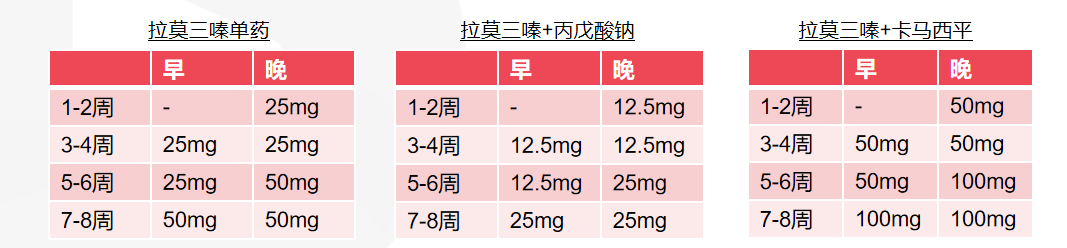 与卡马西平合用,加量速度可稍快,目标治疗剂量:100-200mg/日