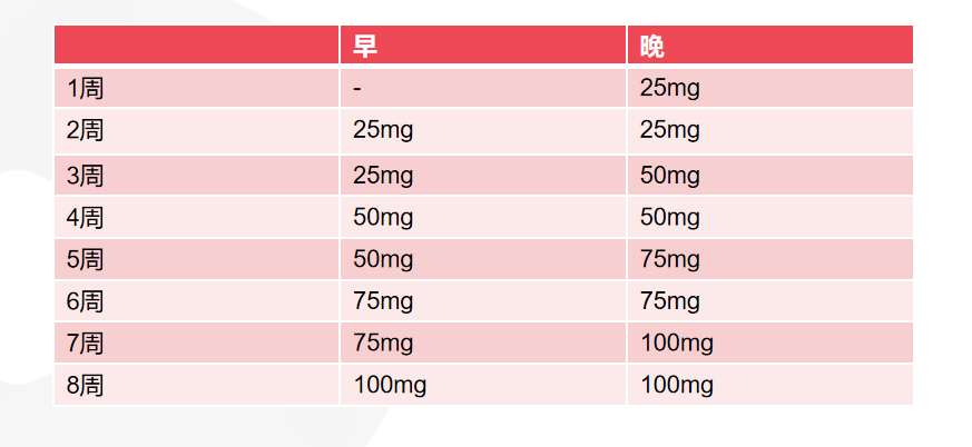 起始剂量:100mg bid,每周增加200mg/日,一般有效治疗范围:400-800mg/日