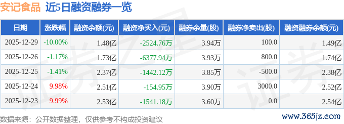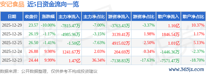 证券之星消息全智股配,截至2025年12月29日收盘,安记食品(603696)报收于23.57元,下跌10.0%,跌停,换手率19.64%,成交量46.19万手,成交额11.17亿元。