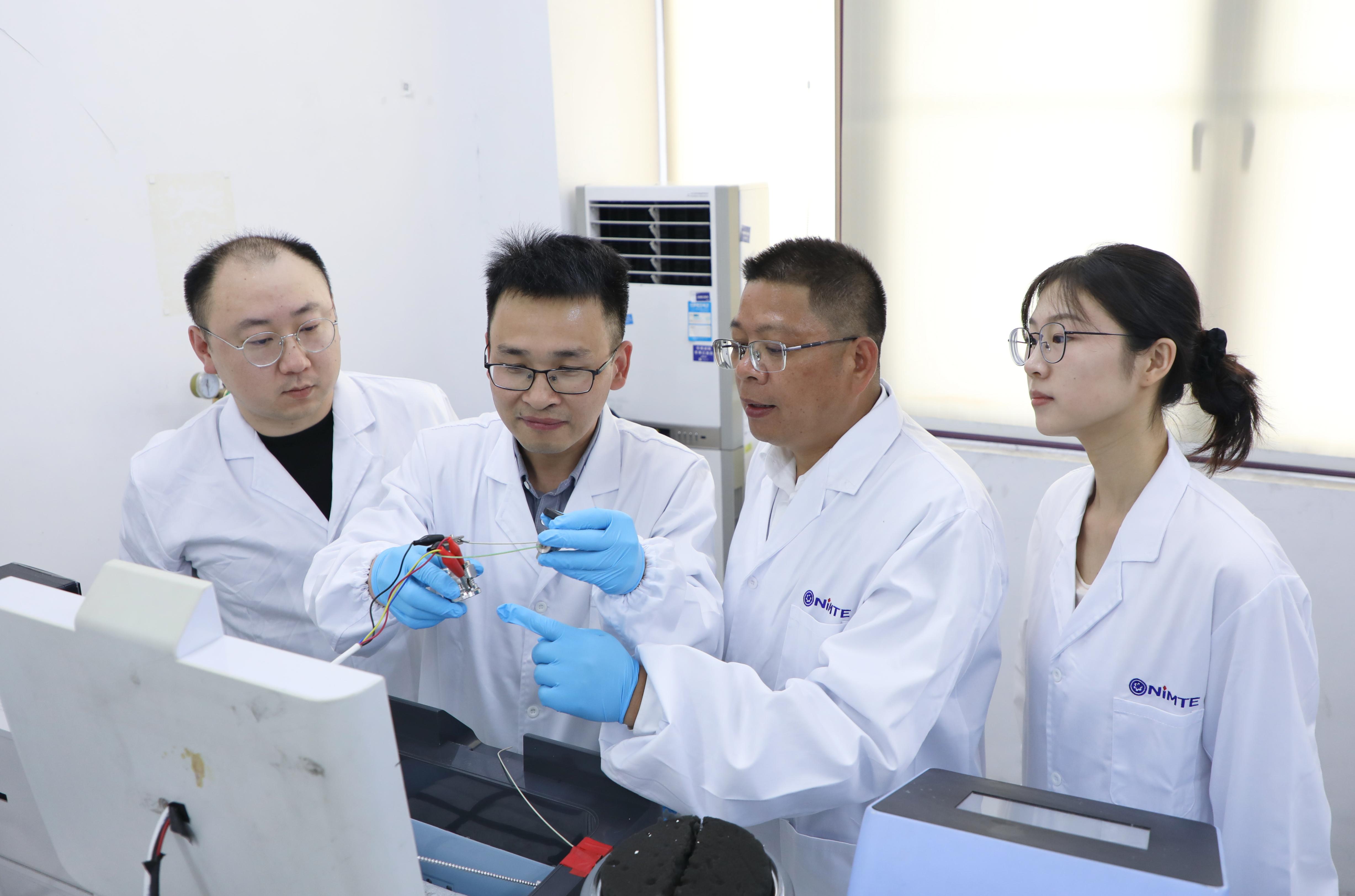 科研团队进行富锂锰基正极材料的电化学性能测试(从左到右:梁灏严、邱报、刘兆平、顾可欣)