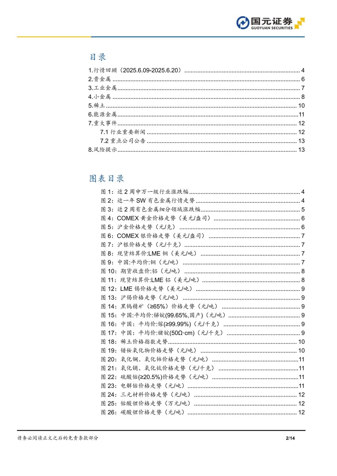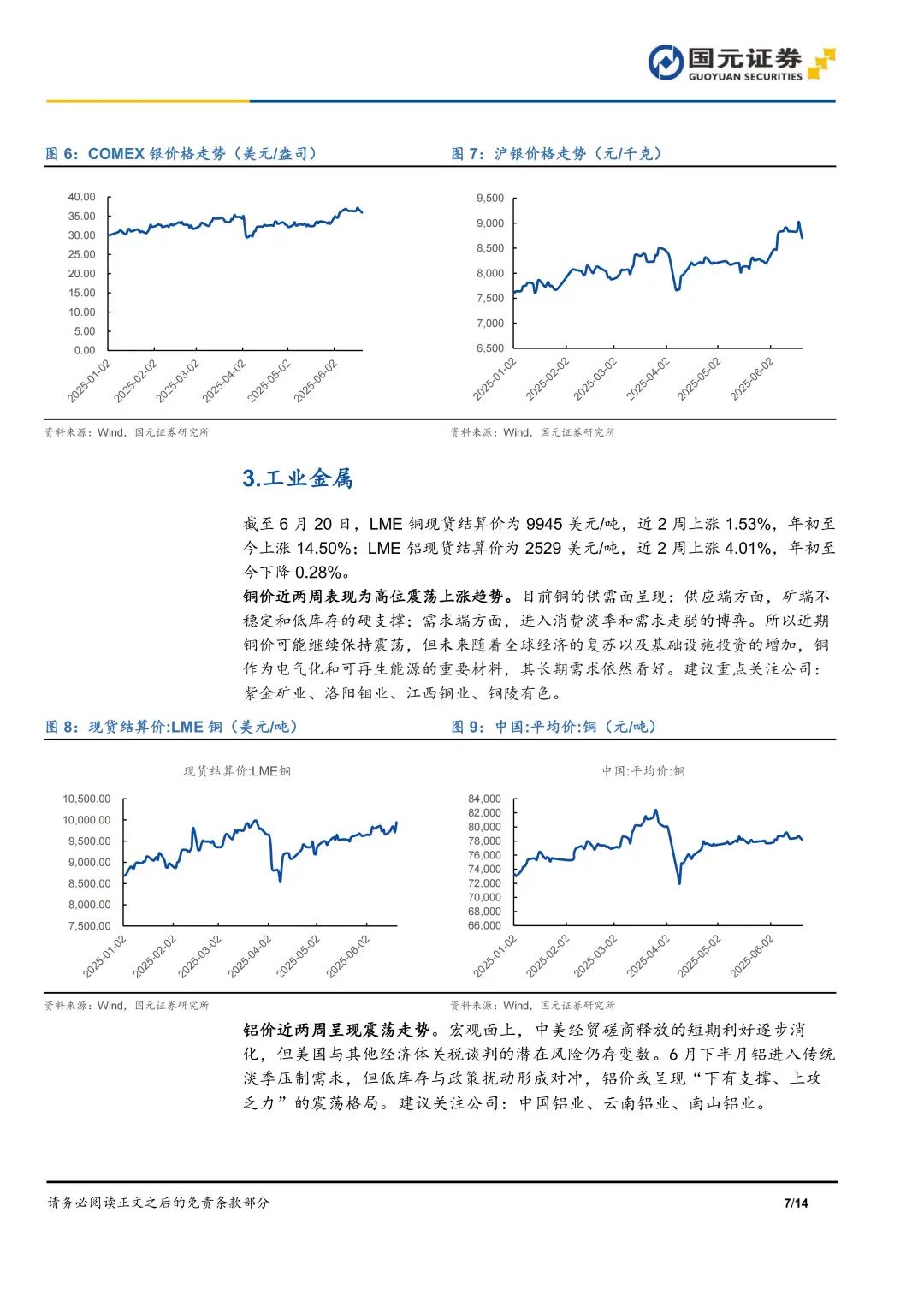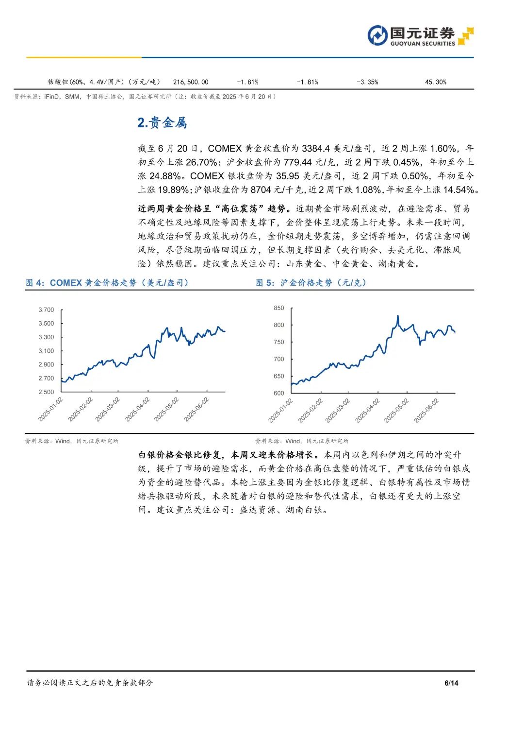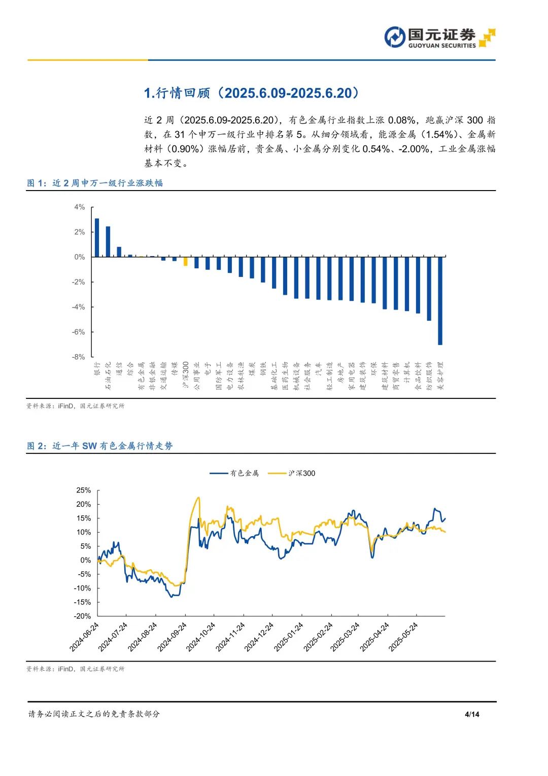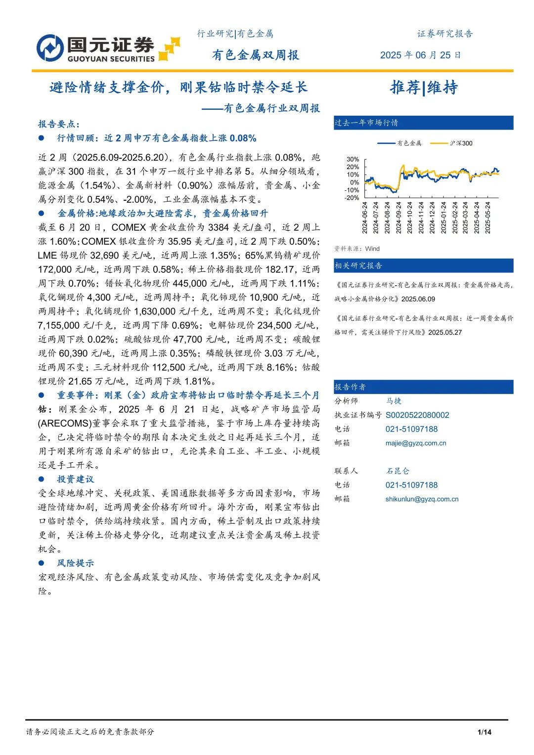 本报告摘自国元证券2025年6月25日已发布的《避险情绪支撑金价,刚果钴临时禁令延长——有色金属行业双周报》,具体报告及分析内容请详见报告。若因对报告的摘编等产生歧义,应以报告发布当日的完整内容为准。