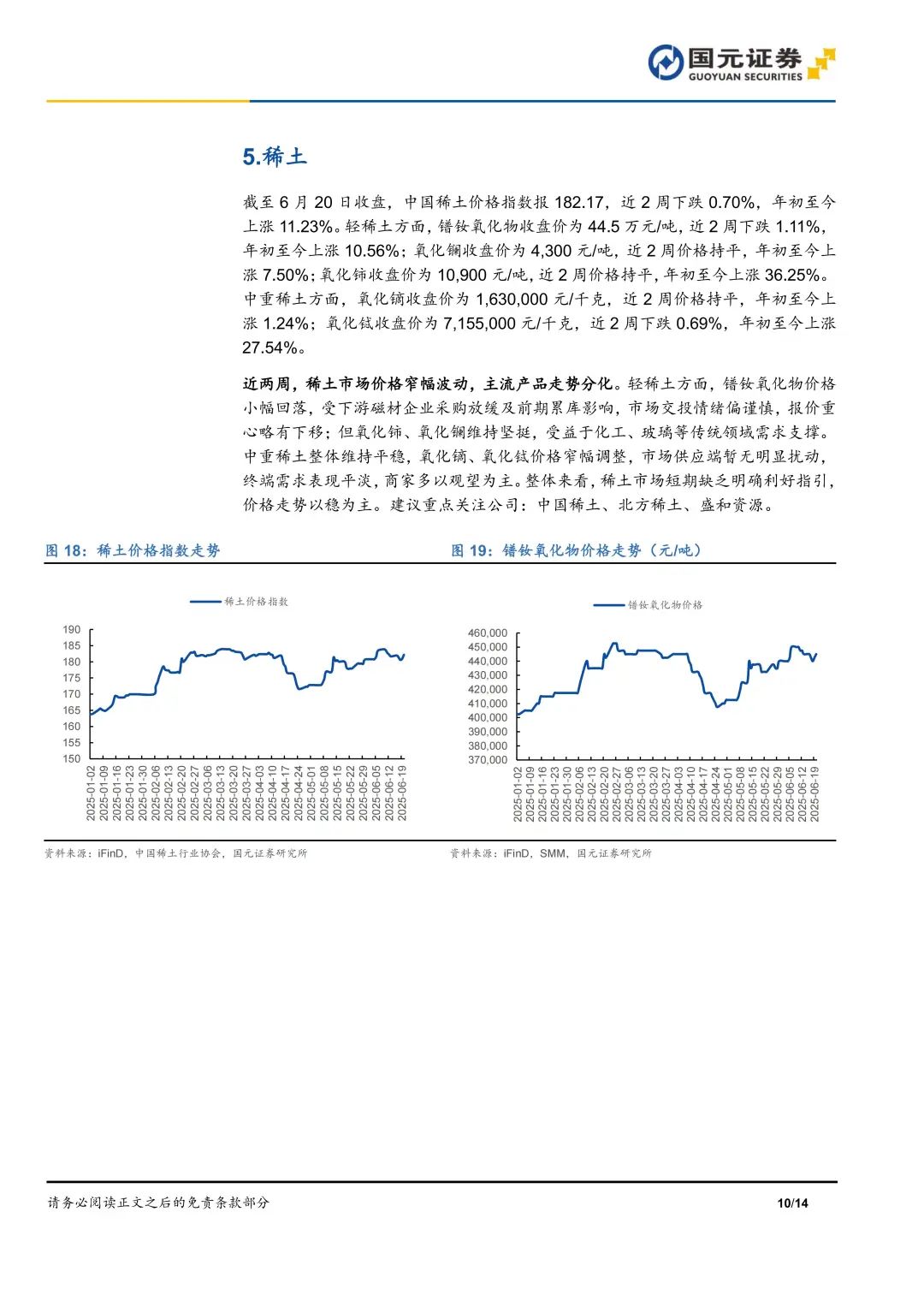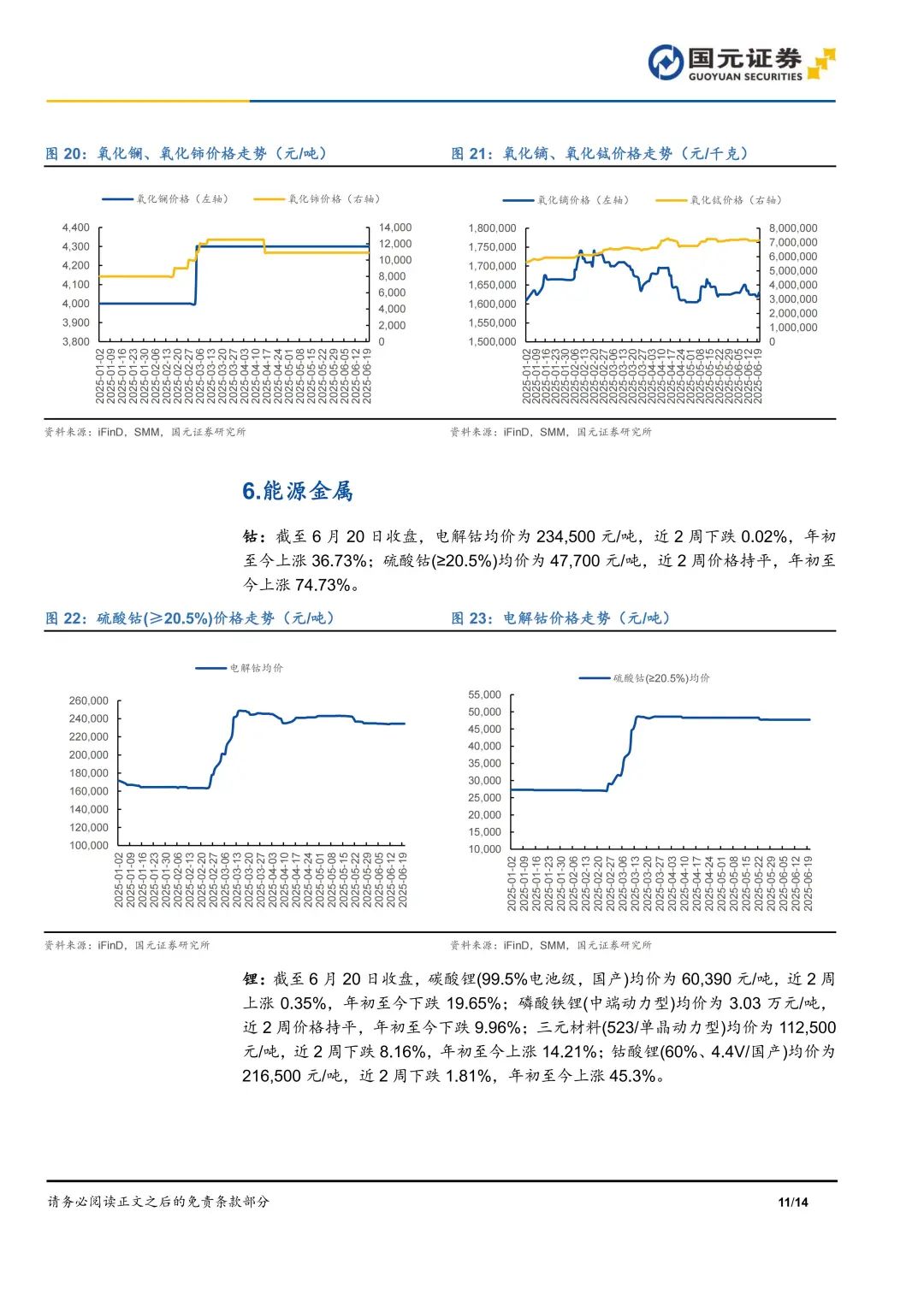 截至6月20日,COMEX黄金收盘价为3384美元/盎司,近2周上涨1.60%;COMEX银收盘价为35.95美元/盎司,近2周下跌0.50%;LME锡现价32,690美元/吨,近两周上涨1.35%;65%黑钨精矿现价172,000元/吨,近两周下跌0.58%;稀土价格指数现价182.17,近两周下跌0.70%;镨钕氧化物现价445,000元/吨,近两周下跌1.11%;氧化镧现价4,300元/吨,近两周持平;氧化铈现价10,900元/吨,近两周持平;氧化镝现价1,630,000元/千克,近两周不变;氧化铽现价7,155,000元/千克,近两周下降0.69%;电解钴现价234,500元/吨,近两周下跌0.02%;硫酸钴现价47,700元/吨,近两周不变;碳酸锂现价60,390元/吨,近两周上涨0.35%;磷酸铁锂现价3.03万元/吨,近两周不变;三元材料现价112,500元/吨,近两周下跌8.16%;钴酸锂现价21.65万元/吨,近两周下跌1.81%。