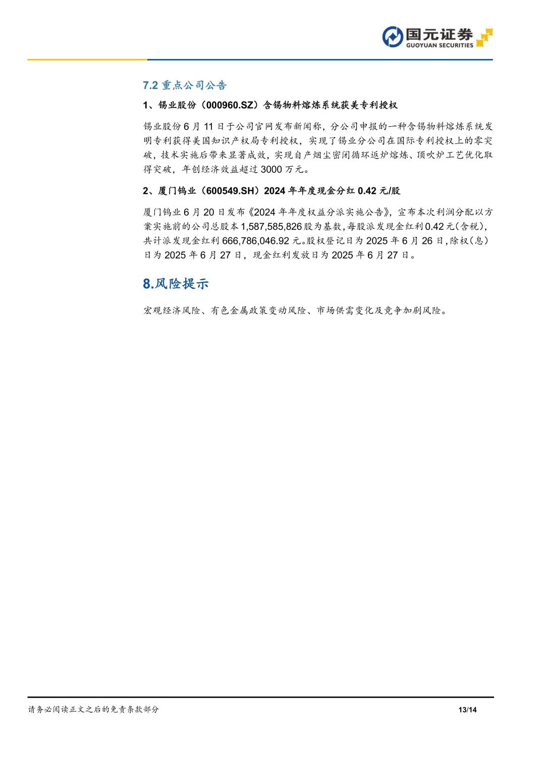 风险提示]article_adlist-->宏观经济风险、有色金属政策变动风险、市场供需变化及竞争加剧风险。