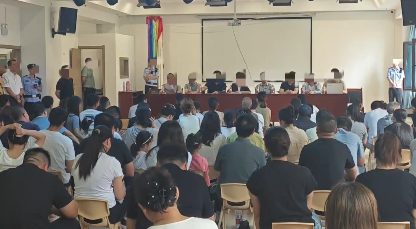 一段7秒的视频显示,主席台多名工作人员向数十名家长通报情况,现场还有警务人员值守,手持执法记录仪。