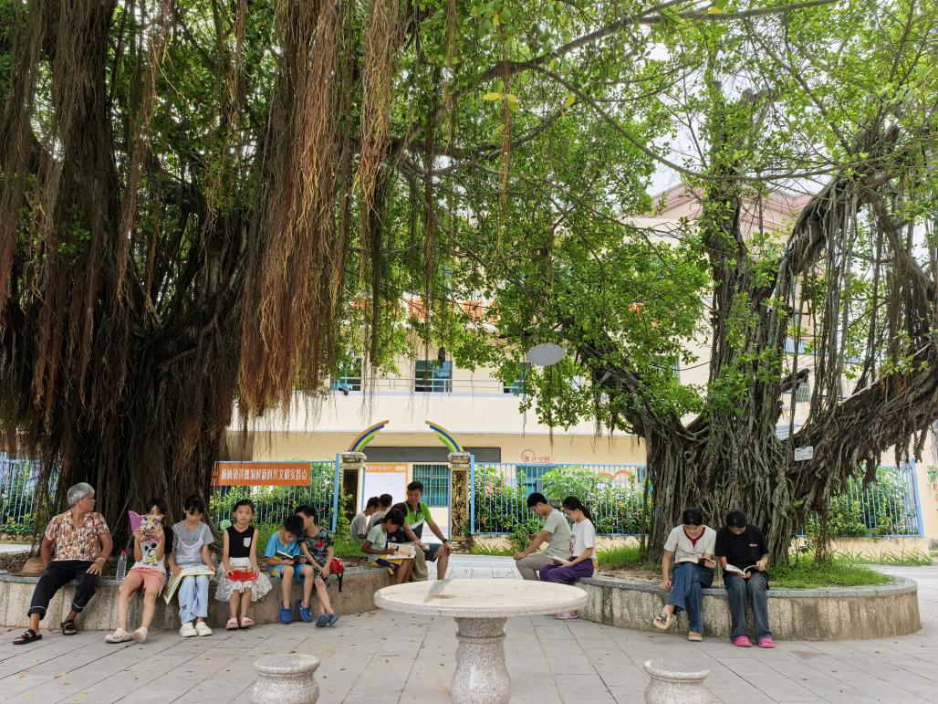 杨梅镇黄槐村村民及孩子们在榕树下收听“文明乡风村村响”
