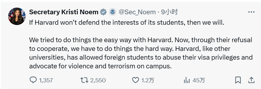 国土安全部部长诺姆说,由于哈佛“拒绝合作”,“我们不得不采取强硬的方式”。她指责哈佛大学和其他一些大学允许“外国学生滥用签证特殊待遇,在校园内鼓吹暴力和恐怖主义”。